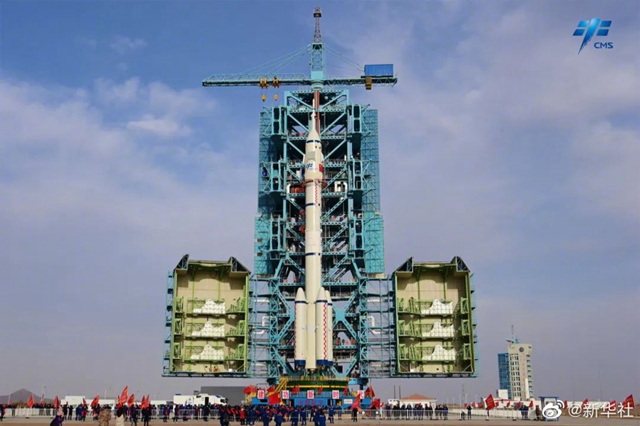 北京时间2022年11月21日,神舟十五号载人飞船与长征二号F遥十五运载火箭组合体已转运至发射区。目前,发射场设施设备状态良好,后续将按计划开展发射前的各项功能检查、联合测试等工作。(中国载人航天)