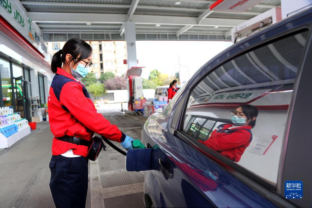 11月21日,在江苏省连云港市连云区一加油站,工作人员给汽车加油。新华社发(王春 摄)