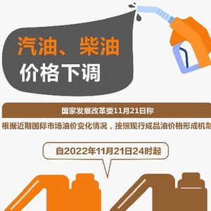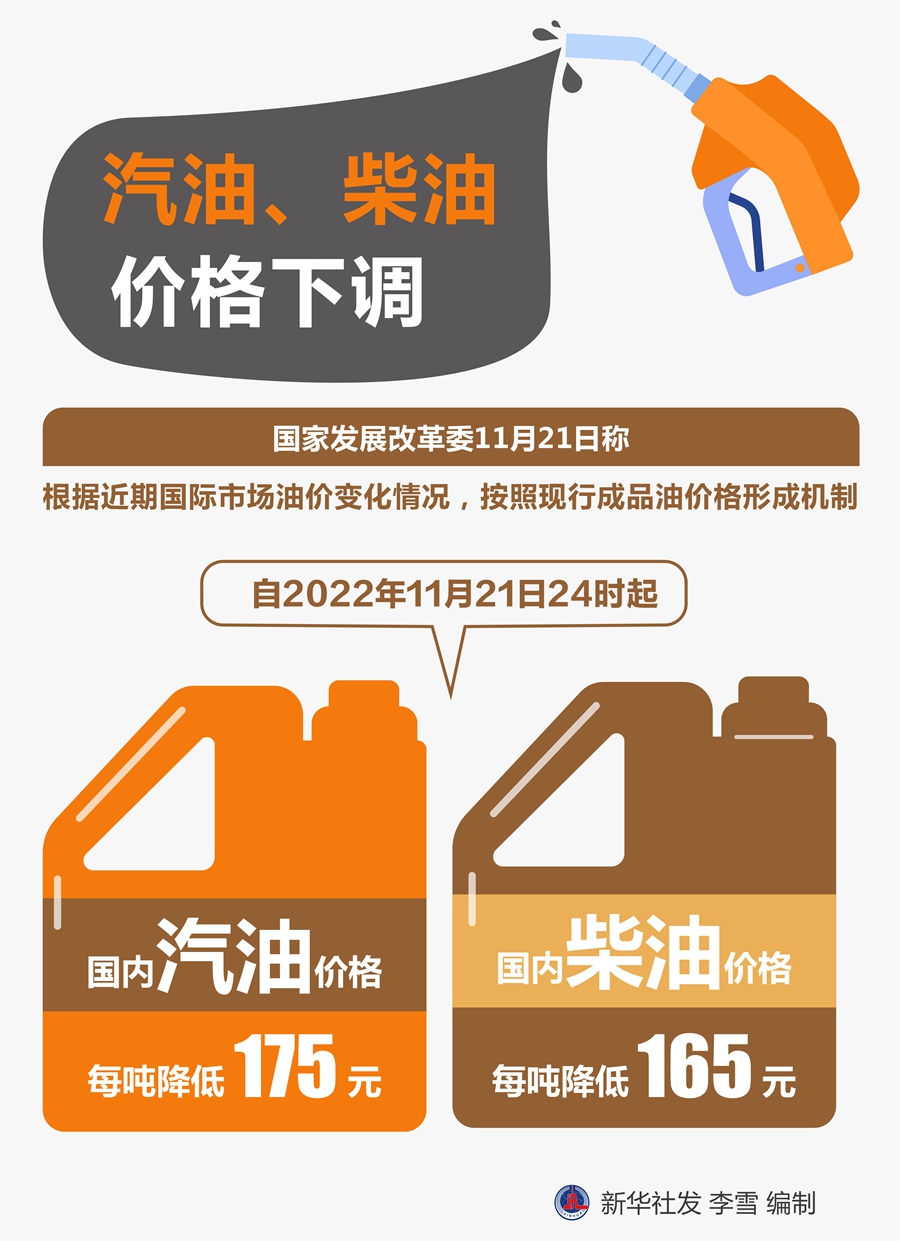 新华社北京11月21日电(记者安蓓)国家发展改革委21日称,根据近期国际市场油价变化情况,按照现行成品油价格形成机制,自2022年11月21日24时起,国内汽油、柴油价格每吨分别降低175元和165元。