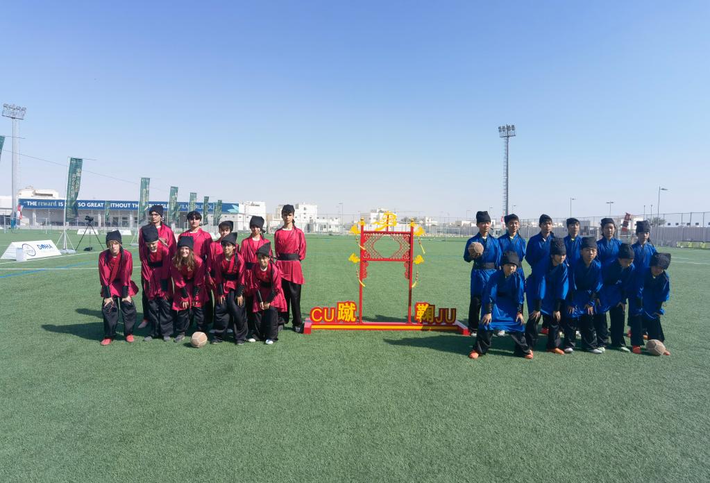作为一项有着两千年历史的足上球类运动,中国蹴鞠在2004年被国际足联正式确认为世界足球运动起源,山东淄博为世界足球起源地。在当日活动现场,中国临淄蹴鞠队的第七代传承人李伟鹏进行了“白打蹴鞠”表演,展示蹴鞠比赛的花样和技巧。来自中国的11名足球少年和卡塔尔当地青训机构的小球员换上中国传统蹴鞠服饰,在李伟鹏带领下共同尝试和体验蹴鞠,感受蹴鞠与现代足球的异同。随后,双方还进行了一场中国-卡塔尔青少年友谊赛。