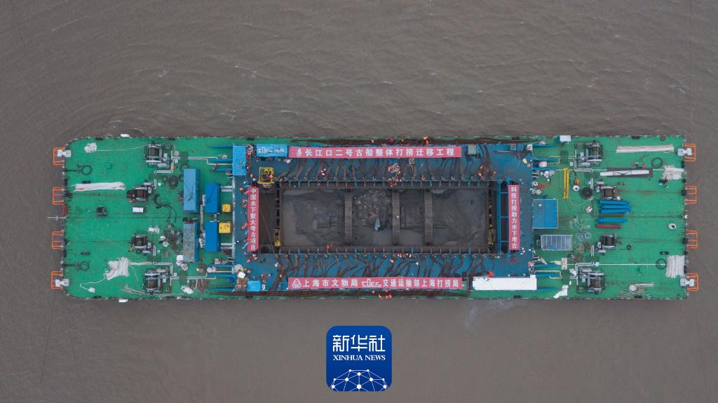11月21日清晨拍摄的“奋力”轮“怀抱”古船的画面(无人机照片)。新华社记者 金立旺 摄