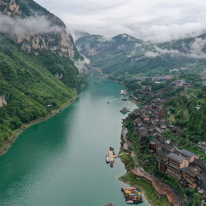 土家人的母亲河酉水河畔,重庆市酉阳土家族苗族自治县河湾山寨古香古色,吊脚楼倒映在碧波之上,与飘荡在河面的乌篷船动静结合,构成了一幅秀美的山水画卷。