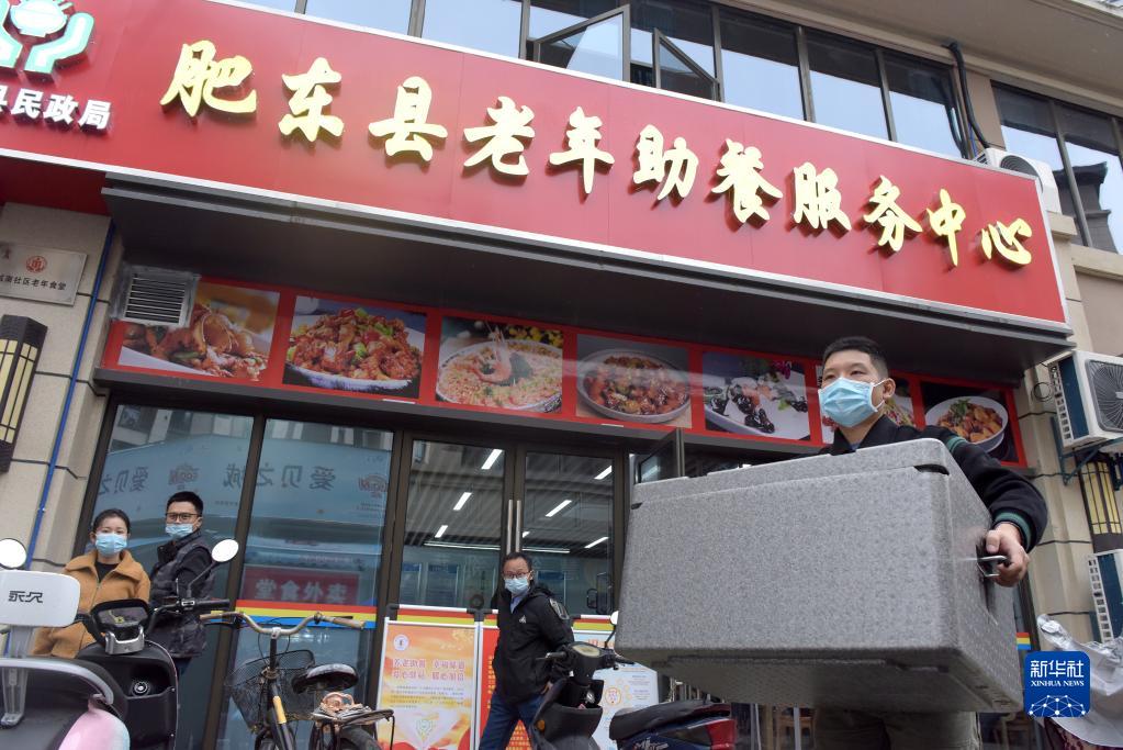 11月22日,在安徽省合肥市肥东县老年助餐服务中心前,肥东县老年助餐服务中心经理李杰(右一)将打包好的午餐往周边老人家中配送。