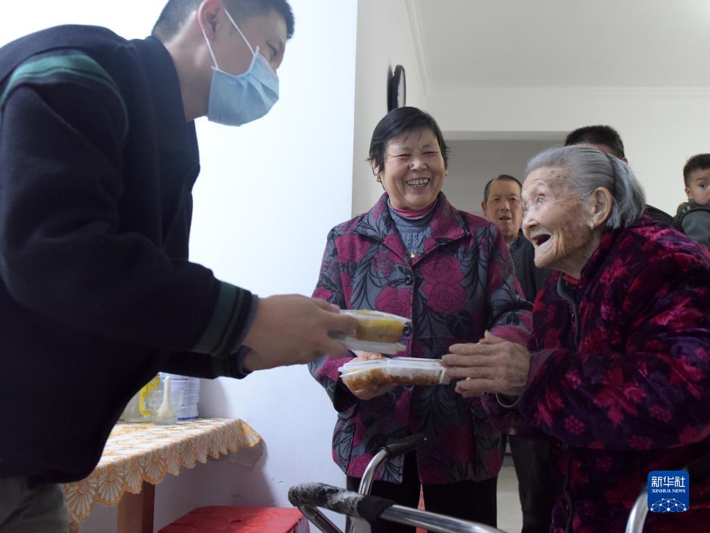 11月22日,安徽省合肥市肥东县店埠镇迎河家园内,肥东县老年助餐服务中心经理李杰(左)在给102岁的老人朱广珍(右一)送上午餐。