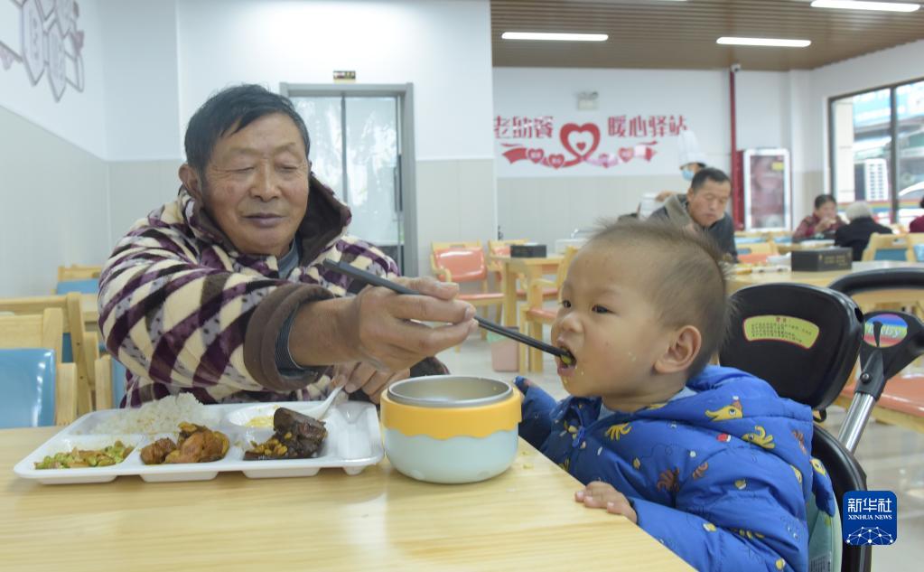 11月22日,安徽省合肥市肥东县老年助餐服务中心内,老人邹帮友(左)带着孙子就餐。
