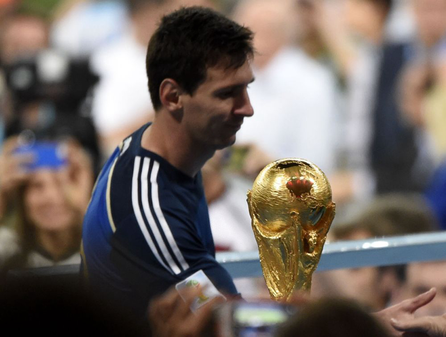 2014年巴西世界杯决赛,梅西率领的阿根廷队与德国队在90分钟内战成0比0平。最终通过加时赛,阿根廷队以0比1负于德国队,获得亚军。梅西与大力神杯擦肩而过(2014年7月13日摄)。新华社记者吕小炜摄