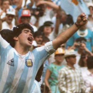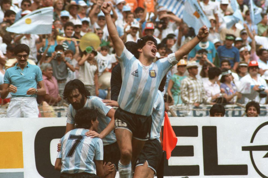 图为1986年6月29日,阿根廷队在墨西哥世界杯决赛中以3比2战胜西德队,马拉多纳(前)振臂欢呼胜利。新华社记者马占成摄