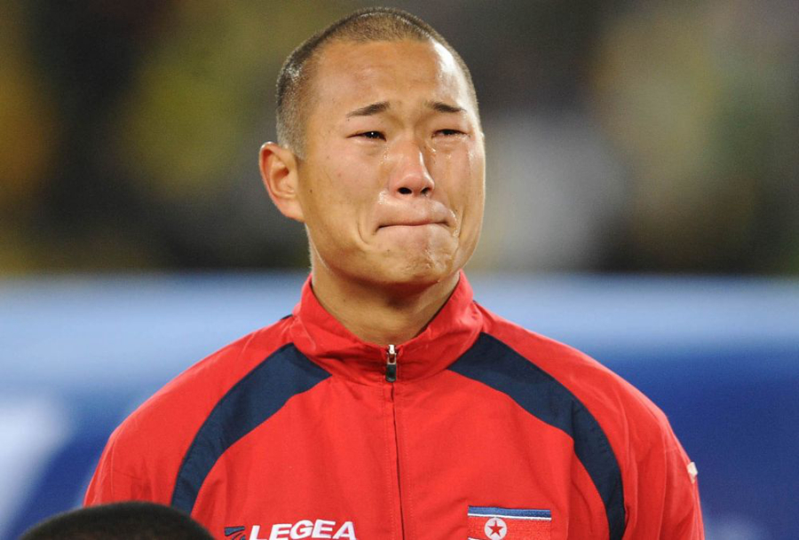2010年6月15日,在南非世界杯小组赛朝鲜队与巴西队的比赛开始前,朝鲜队球员郑大世在朝鲜国歌奏响时泪流满面。新华社记者李尕摄