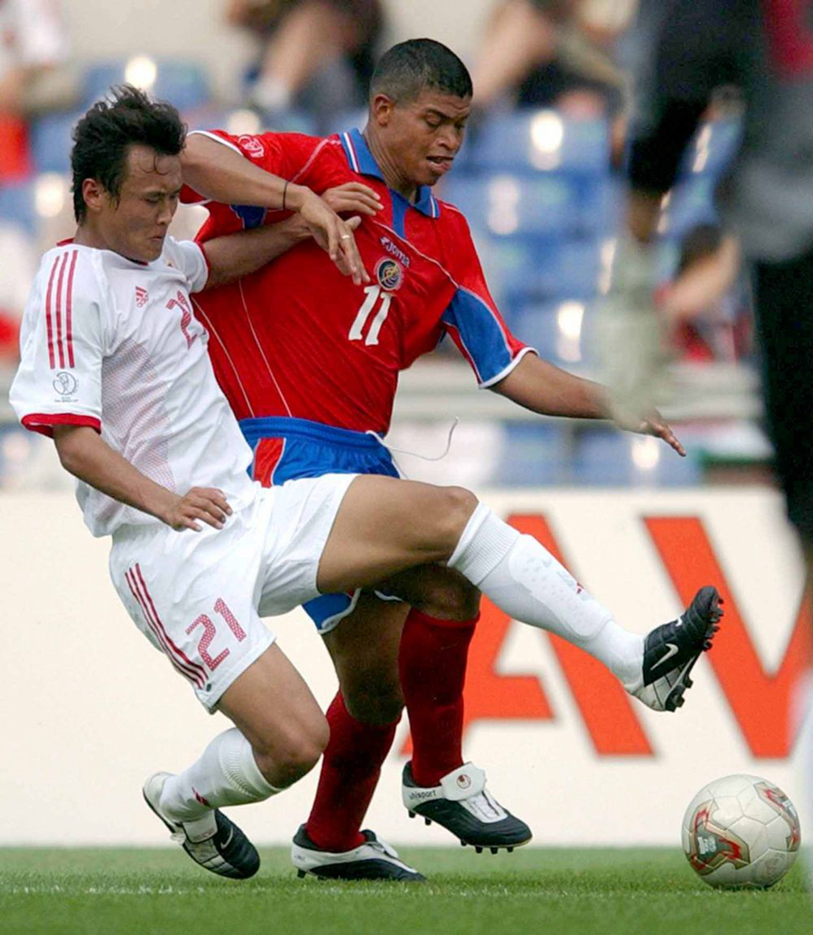 图为2002年6月4日,在韩国光州进行的世界杯C组第二场比赛中,双方球员在比赛中拼抢,中国队首战以0比2负于哥斯达黎加队。新华社记者戚恒摄