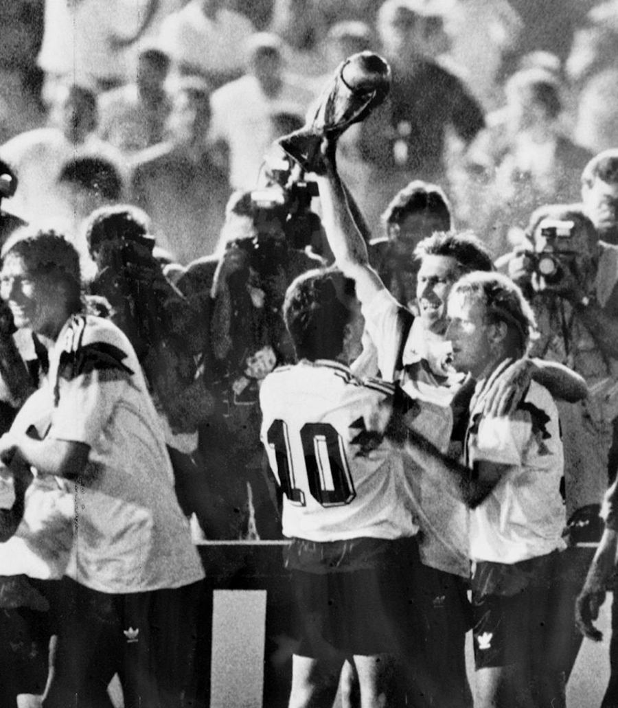 1990年7月8日,联邦德国队在罗马奥林匹克体育场以1:0战胜阿根廷队,获得第十四届世界杯足球赛冠军。图为队员们高擎金杯庆祝。新华社记者徐步摄
