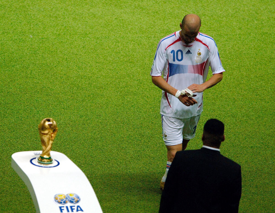 在2006年德国世界杯对阵意大利队的决赛中,法国队球员齐达内(上)被出示红牌离场时从大力神杯旁经过(2006年7月9日摄)。新华社记者刘大伟摄