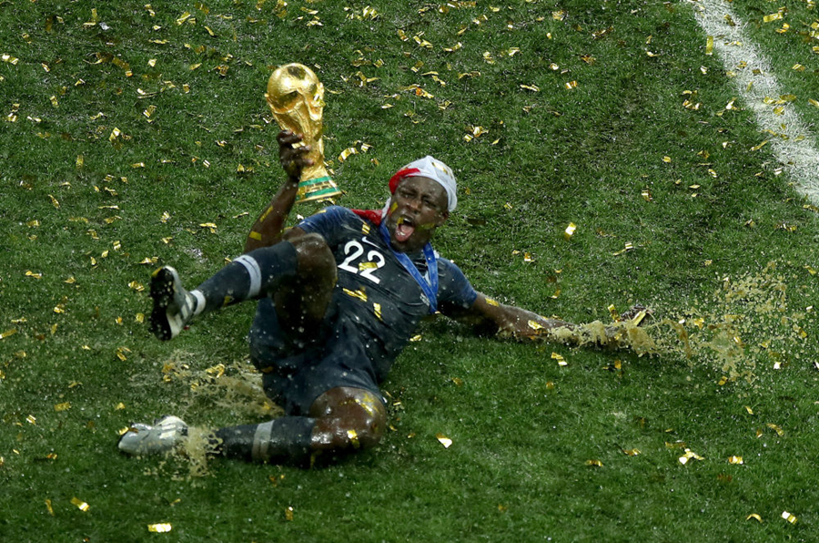 2018年俄罗斯世界杯足球赛决赛,法国队以4比2战胜克罗地亚队,继1998年后再夺世界杯冠军。图为法国队球员门迪手捧大力神杯庆祝(2018年7月15日摄)。新华社记者吴壮摄