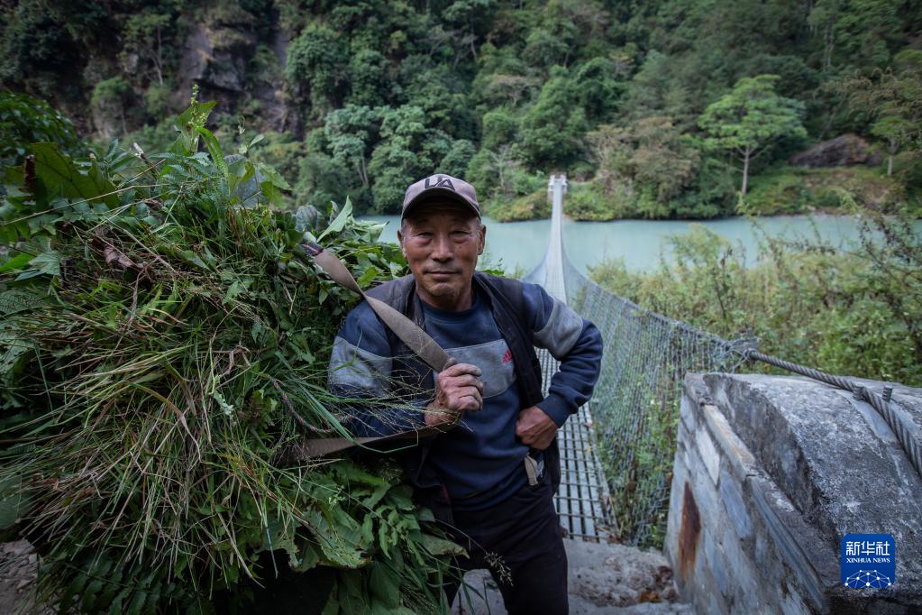 11月8日,在尼泊尔勒姆宗县,村民走过水电站项目公司帮助修缮的吊桥。