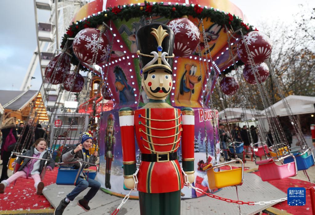 11月24日,孩子们在法国巴黎杜伊勒里花园的圣诞市场嬉戏。