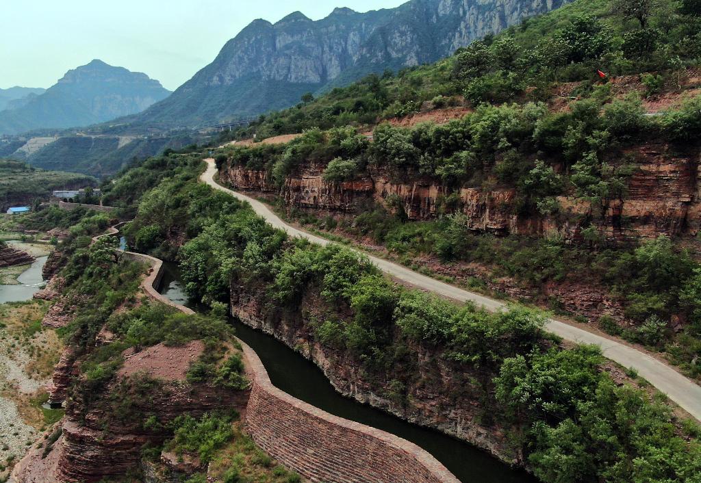 这是蜿蜒穿行于太行山间的红旗渠总干渠(2019年7月4日摄,无人机照片)。新华社记者李安摄