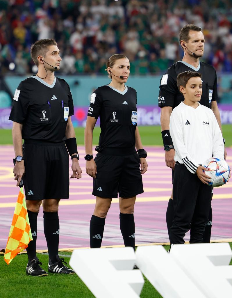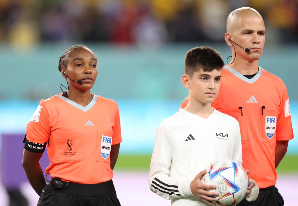 11月22日,卡塔尔世界杯D组法国队对阵澳大利亚队,第四官员、卢旺达裁判萨利玛·穆坎桑加(左)在比赛前