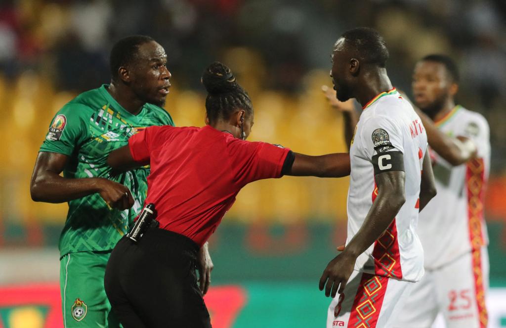 1月18日,穆坎桑加(中)作为主裁判执裁男足非洲国家杯津巴布韦队与几内亚队的比赛