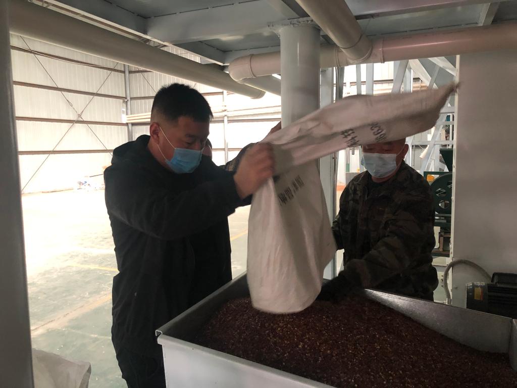 酸枣仁产业园内,工人正在将酸枣放入加工机器。(受访者供图)