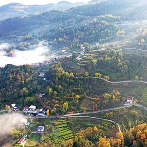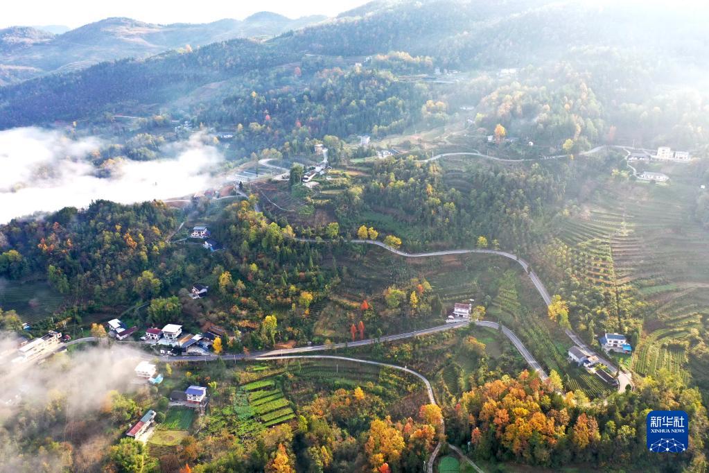 通往宣恩县珠山镇东门关村的乡村公路在色彩斑斓的山间穿行(11月25日摄,无人机照片)。