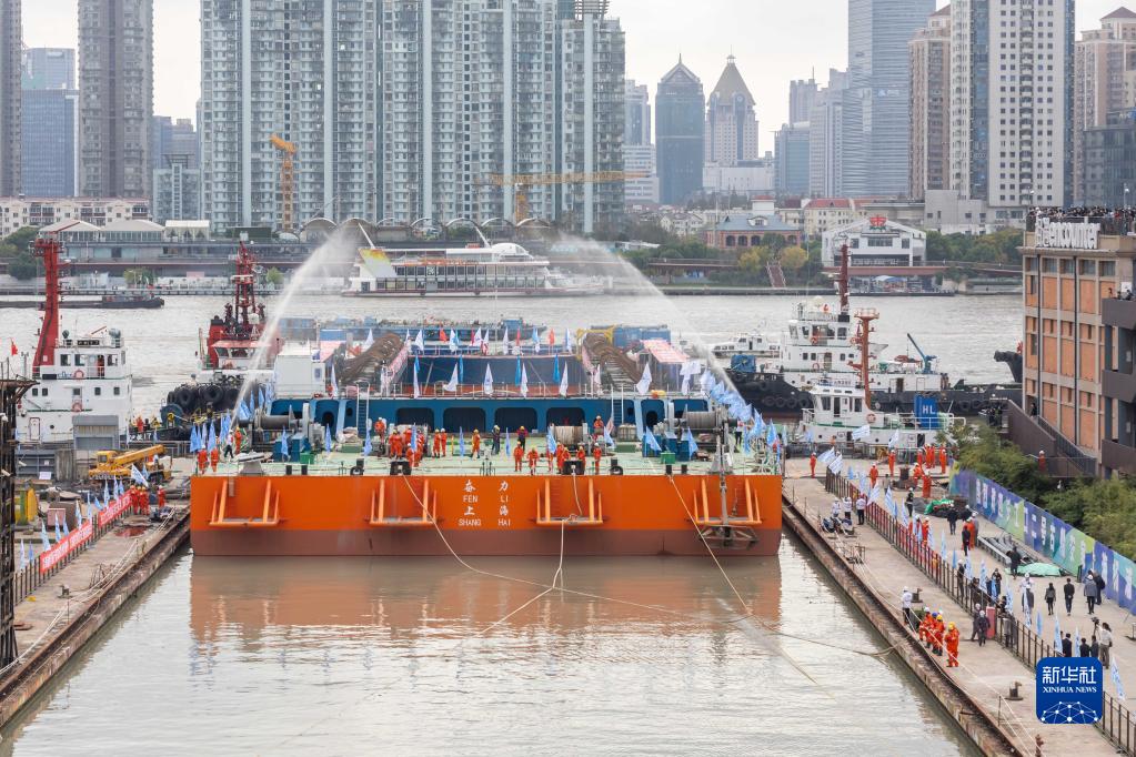 11月25日,“奋力”轮载着长江口二号古船进入上海船厂旧址1号船坞,现场喷水庆祝。