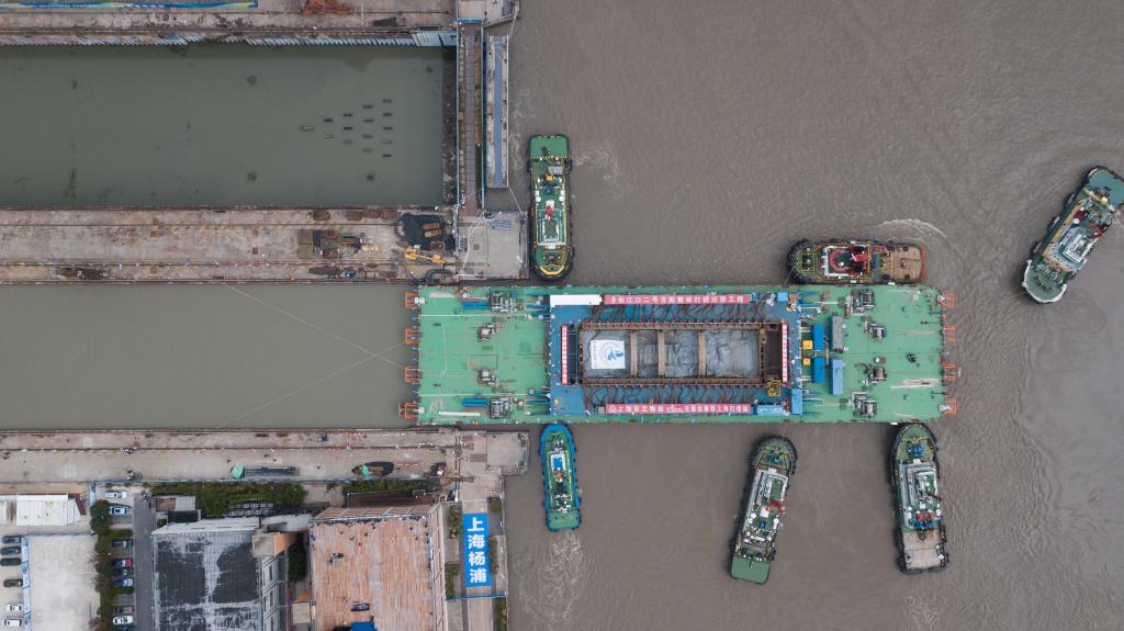 25日上午,“奋力”轮小心翼翼“怀抱”着21日凌晨出水的长江口二号古船,经杨浦大桥如期抵达船坞外位置,等待潮水“助力”。