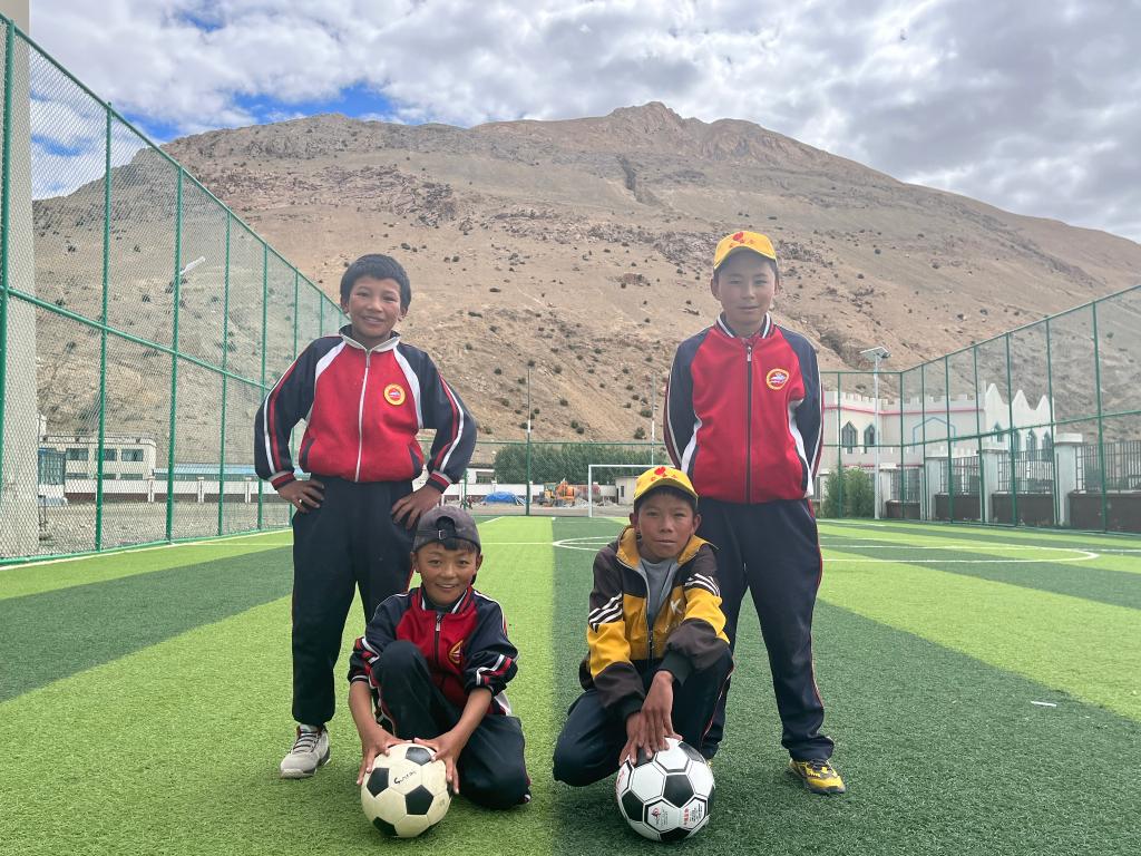 今年6月毕业前夕,格旦曲桑(前左)和同学在扎西宗乡完全小学的足球场上合影留念