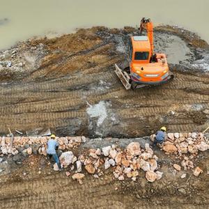 11月26日,施工人员在常宁市胜桥镇河道综合治理项目现场作业。