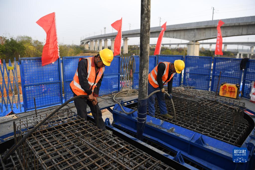 11月26日,中铁四局施工人员在新建沪宁合高铁安徽段首根墩身浇筑现场作业。