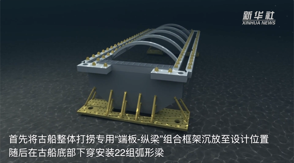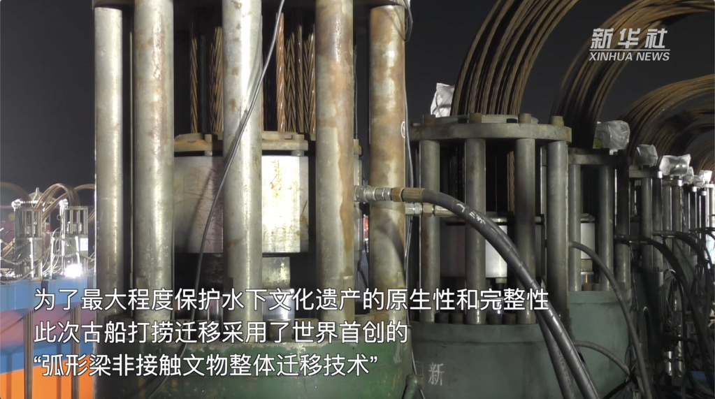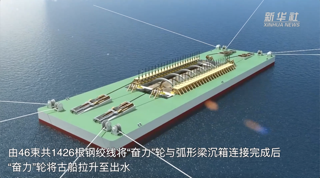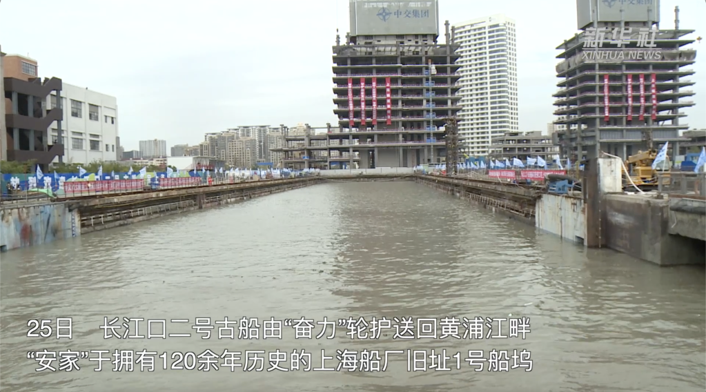 25日长江口二号古船“回家”,进入上海船厂旧址1号船坞。此次古船打捞迁移采取的是“怀抱”式打捞方案——“弧形梁非接触文物整体迁移技术”,犹如“抓娃娃”一样将古船捞进“奋力”轮的怀抱。