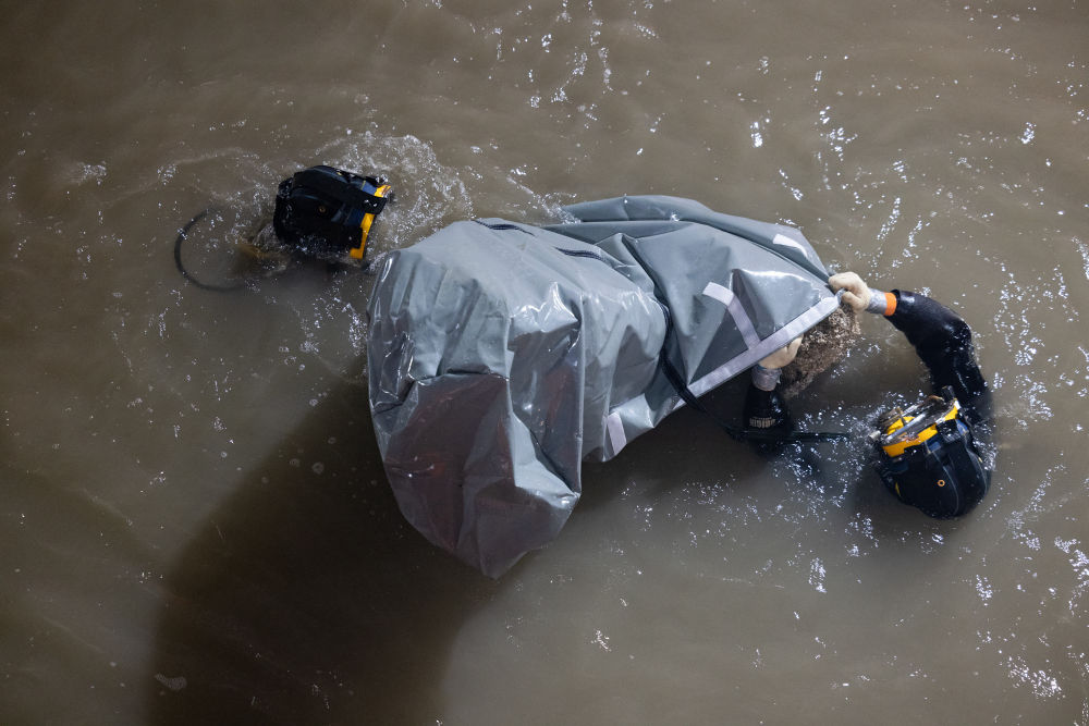 11月20日拍摄的长江口二号古船整体打捞现场。