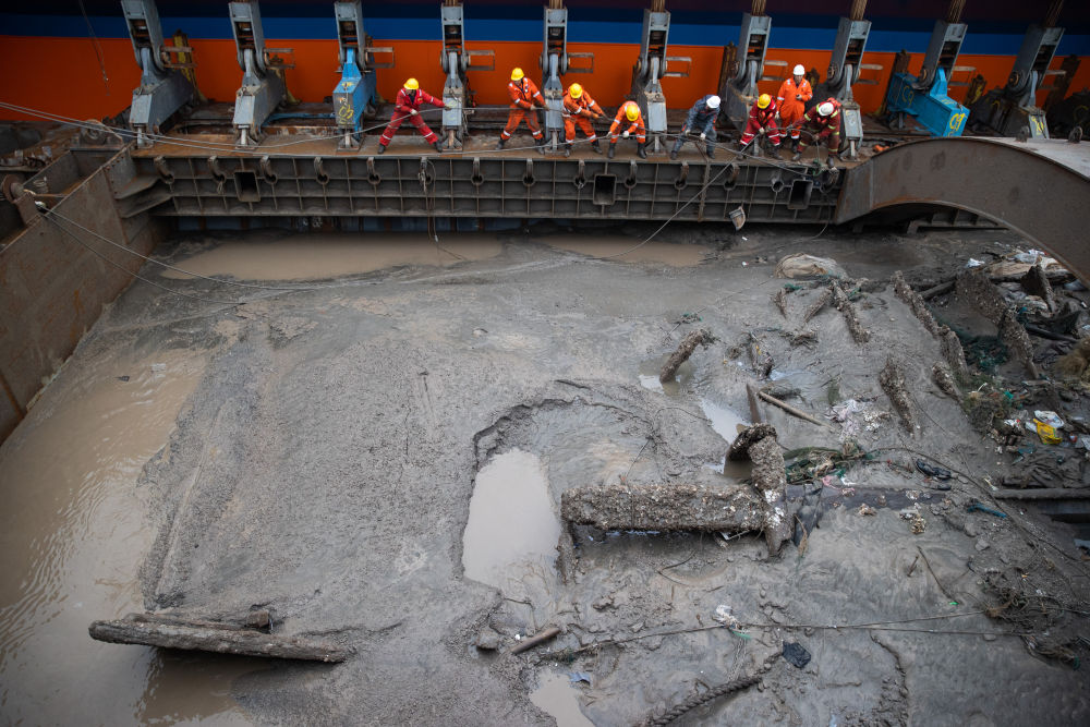 凌晨时分只有桅杆出水,到清晨时更多船体出水。古船的缆绳、舱体等裹着厚厚的淤泥,传递着这艘船的百年沧桑。
