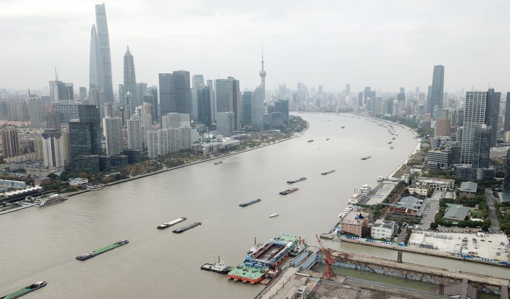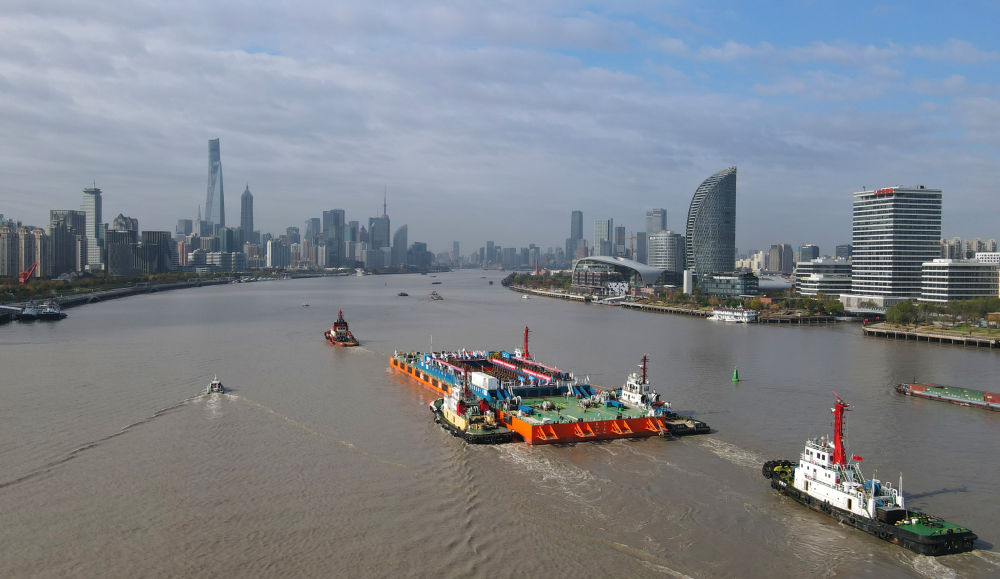 11月25日,装载着长江口二号古船的“奋力”轮航行在黄浦江杨浦滨江水域。