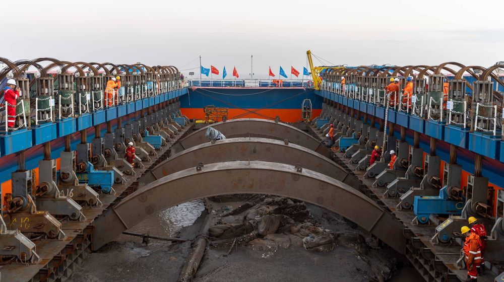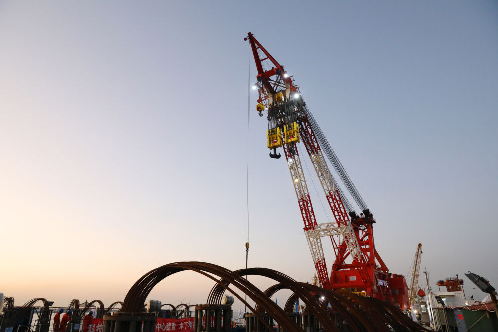 11月21日,工作人员下水给桅杆“穿上”保护衣。
