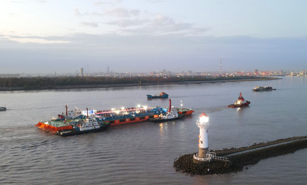 11月25日,装载着长江口二号古船的“奋力”轮,在拖船牵引下航行在吴淞口水域。