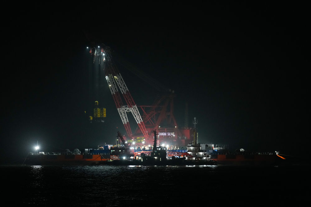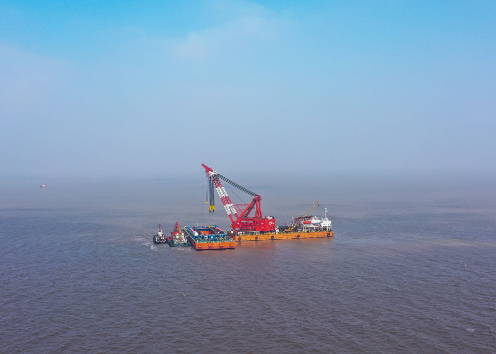 11月21日清晨,工作人员进行长江口二号古船打捞作业。