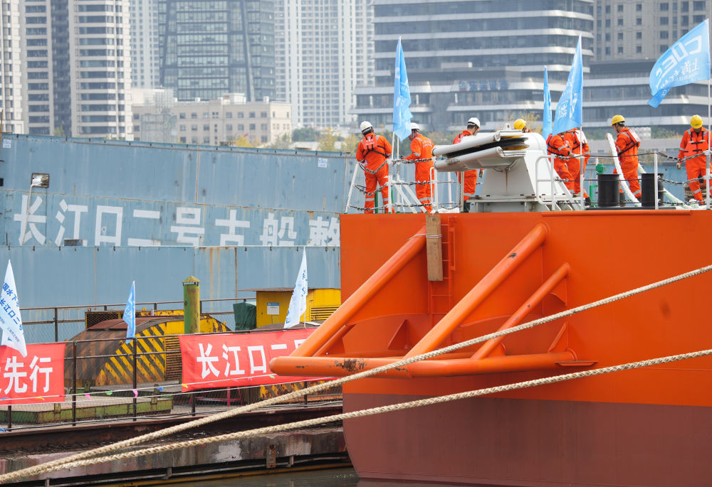 11月25日,“奋力”轮装载着长江口二号古船停靠上海船厂旧址1号船坞,准备进坞。