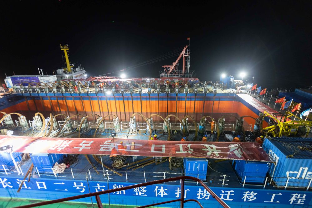 11月25日,“奋力”轮装载着长江口二号古船进入上海船厂旧址1号船坞。