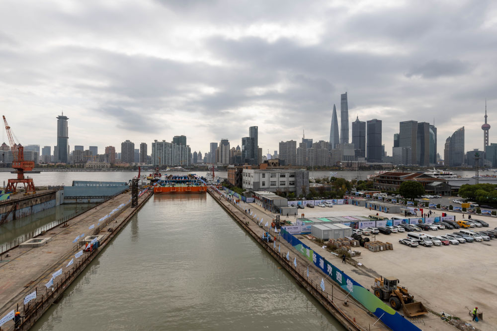上海船厂旧址1号船坞已打开闸门,完成灌水,静候长江口二号古船(11月23日摄)。