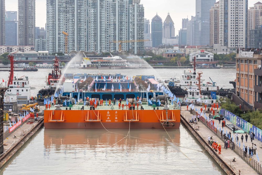11月25日,“奋力”轮装载着长江口二号古船进入上海船厂旧址1号船坞,现场喷水庆祝。