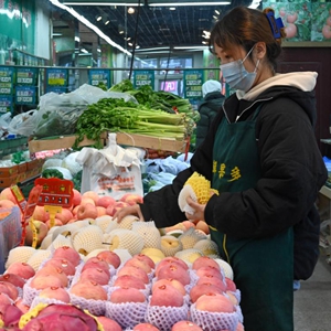 11月28日,店员在乌鲁木齐市南湖南路西二巷的一家水果店内整理货品。新华社记者郝建伟 摄