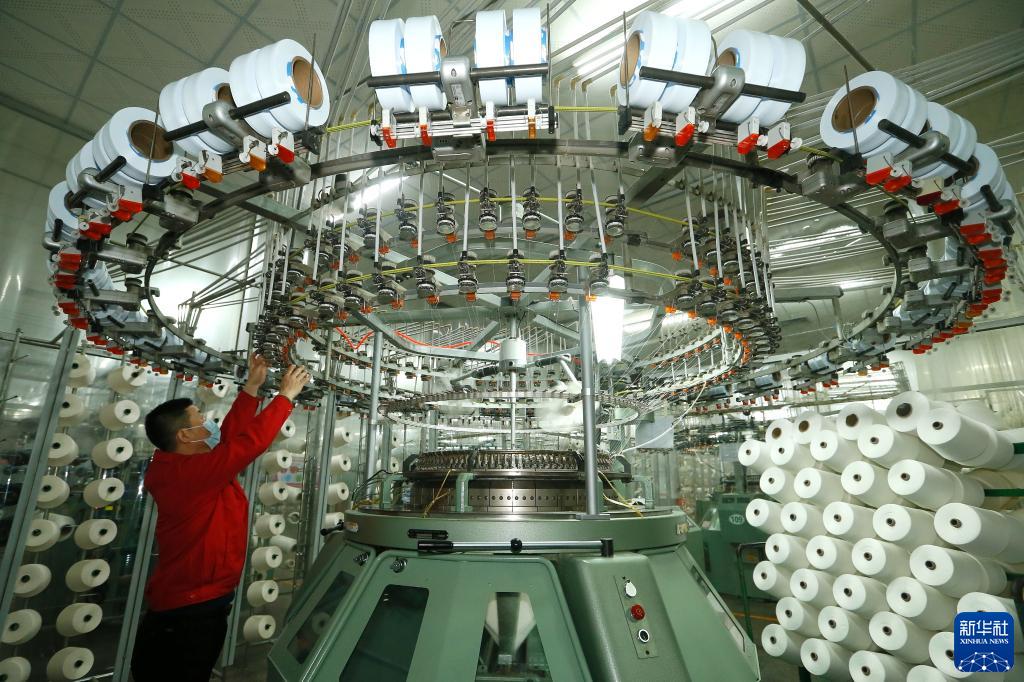 11月29日,山东青岛颐和针织有限公司的纺织工人在生产出口到海外市场的服装面料。