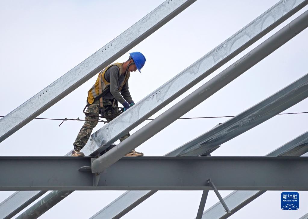 工人在中新南宁国际物流园的电商物流园进行顶棚施工(11月29日摄)。