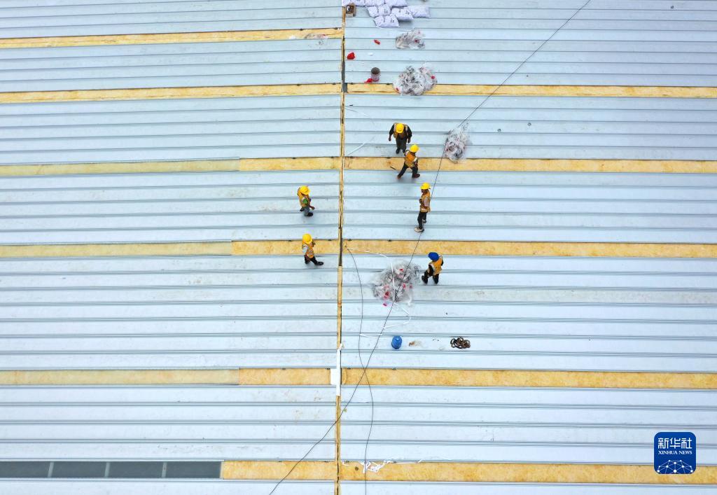 工人在中新南宁国际物流园的电商物流园进行顶棚施工(11月29日摄,无人机照片)。