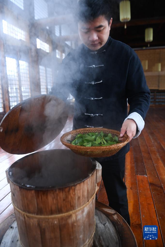 11月30日,大唐贡茶院的紫笋茶制作技艺传承人林瑞炀采用传统方法制茶。这是在蒸鲜叶。