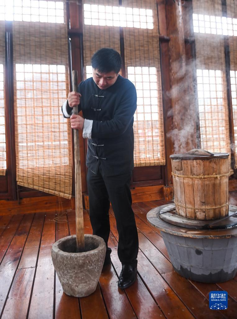 11月30日,大唐贡茶院的紫笋茶制作技艺传承人林瑞炀采用传统方法制茶。这是将蒸好的鲜叶放入石臼中,用木棍捣碎。