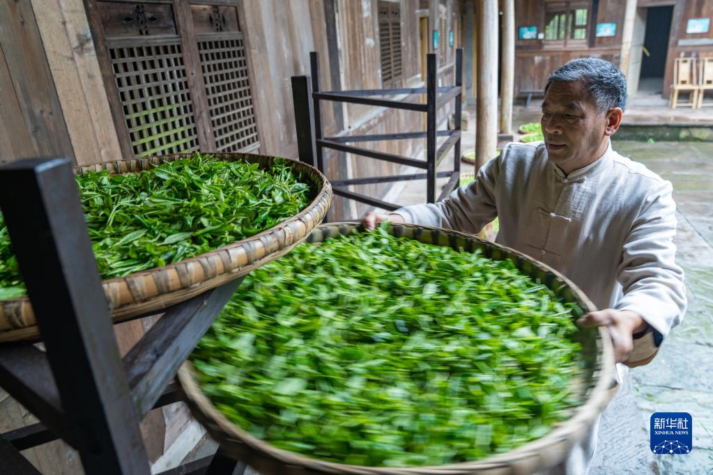在四川省雅安市名山区的张氏祖屋,张跃华用传统方式摊晾新采摘的鲜叶(2022年3月31日摄)。蒙山茶产于四川省雅安市名山区境内的蒙顶山,是绿茶的一种。张跃华,生于1959年,是国家级非物质文化遗产代表性项目——绿茶制作技艺(蒙山茶传统制作技艺)的代表性传承人。张跃华自幼随父亲学习蒙山茶传统制作技艺,是“张氏甘露”第五代传人,他每年都要招收年轻徒弟,希望蒙山茶传统制作技艺能世世代代传承下去。