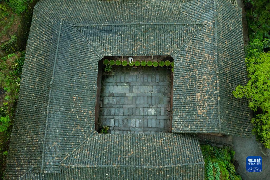 在四川省雅安市名山区的张氏祖屋,张跃华在摊晾刚采摘的鲜叶(2022年3月31日摄,无人机照片)。蒙山茶产于四川省雅安市名山区境内的蒙顶山,是绿茶的一种。张跃华,生于1959年,是国家级非物质文化遗产代表性项目——绿茶制作技艺(蒙山茶传统制作技艺)的代表性传承人。张跃华自幼随父亲学习蒙山茶传统制作技艺,是“张氏甘露”第五代传人,他每年都要招收年轻徒弟,希望蒙山茶传统制作技艺能世世代代传承下去。