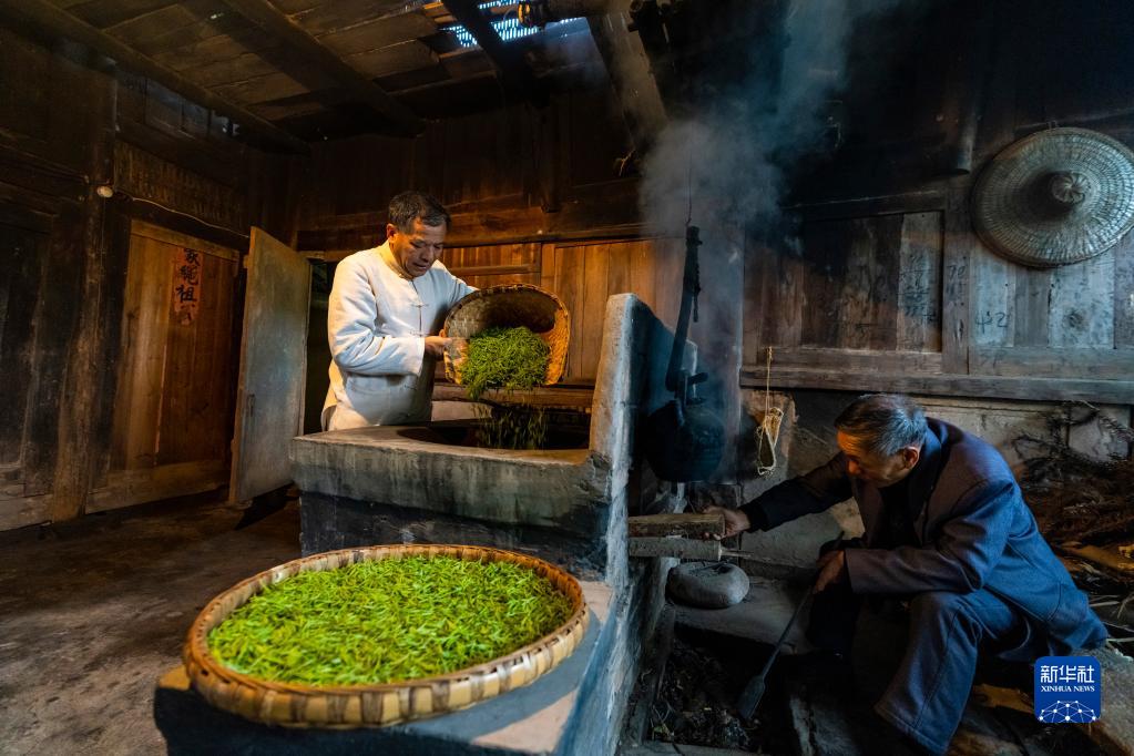 在四川省雅安市名山区的张氏祖屋,张跃华(左)用传统的“红锅杀青”方式对摊晾后的鲜叶进行杀青(2022年3月31日摄)。蒙山茶产于四川省雅安市名山区境内的蒙顶山,是绿茶的一种。张跃华,生于1959年,是国家级非物质文化遗产代表性项目——绿茶制作技艺(蒙山茶传统制作技艺)的代表性传承人。张跃华自幼随父亲学习蒙山茶传统制作技艺,是“张氏甘露”第五代传人,他每年都要招收年轻徒弟,希望蒙山茶传统制作技艺能世世代代传承下去。