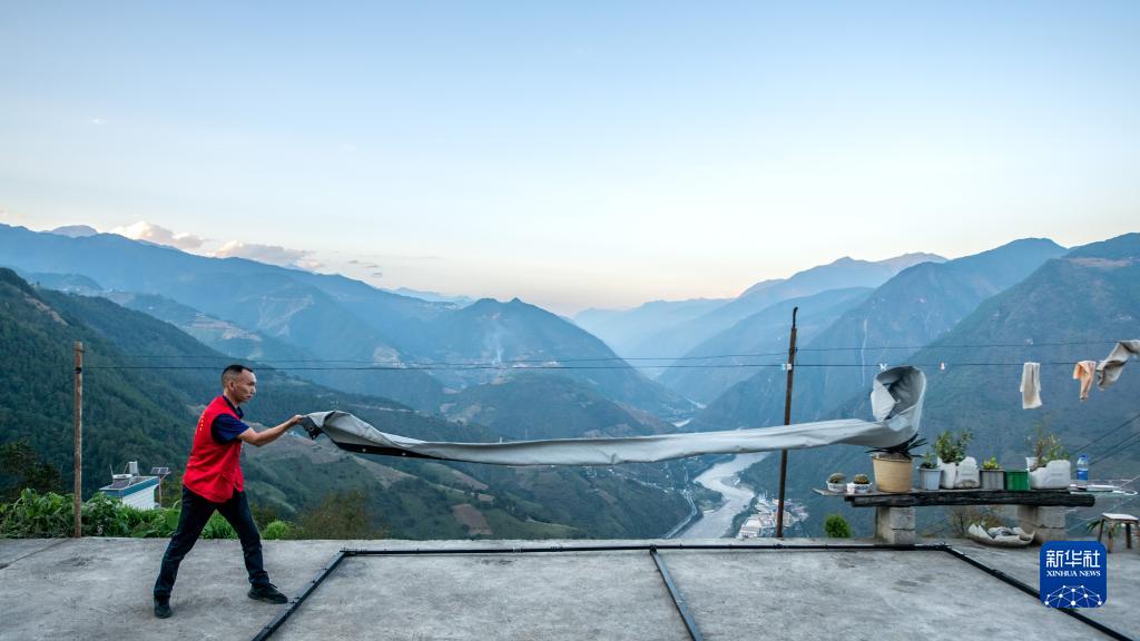 在怒江州泸水市鲁掌镇登梗村,杨明金甩开幕布(2022年10月21日摄)。