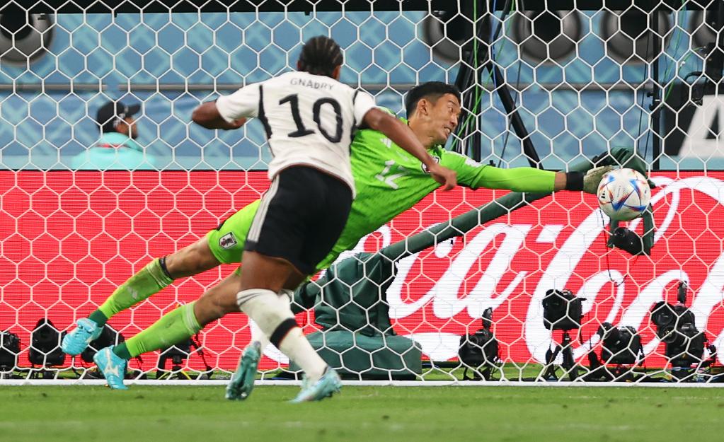 11月23日,日本门将(后)权田修一在对阵德国队的小组赛中扑救。